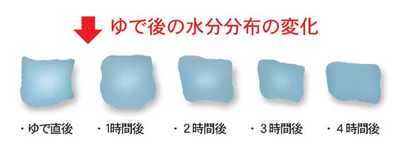 ①ゆで伸び:これはゆで直後の短時間におこるもので、うどん内部の水分格差が時間と共に均一になることが理由です。