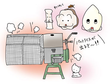 圧力釜を回転させながら高圧加熱し、内部の圧力を一気に開放することで、原料に含まれる水分が瞬時に蒸発し、激しい爆発音とともに膨化します。ポン菓子やポップコーンのように、爆ぜた(はじけた)形状や元の原料が大きく膨らむことが特徴です。圧力釜の蓋を開けるときに「パーン」と大きな音がするからか、それとも「パッ」できあがるお菓子だからなのかは不明ですが、香川ではポン菓子のことを「パットライス」といいます。昔はパットライスのおじさんがやってくると子供たちが群がり、圧力釜が「パーン」と開くのを、固唾をのんで見守っていました。