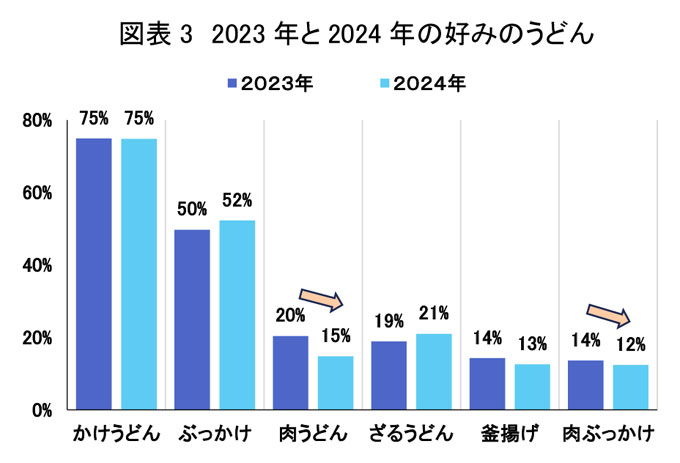 好みのうどんは、かけうどん(75%)>ぶっかけ(52%)>ざるうどん(21%)>肉うどん(15%)>釜揚げ(13%)>肉ぶっかけ(12%)と続きます。