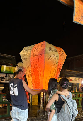 古い街並みが残る十分の名物といえば、何といっても「ランタン飛ばし」。十分老街には土産物店や飲食店が立ち並び、そこでランタンも購入できます。ランタンは色によってご利益が異なり、赤は健康運、黄は金運、青は仕事運、紫は勉強運といった具合です。Aと私は即決で4色ランタンを選び(なんという強欲さ!)、それぞれ願いごとを書き入れました(右画像)。