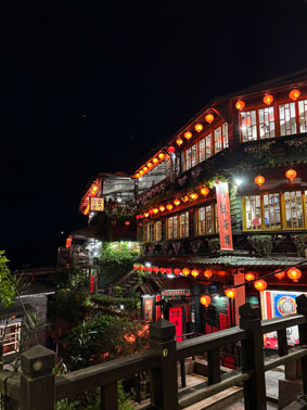 我慢した甲斐あって、小雨の中で幾重にも連なる提灯の灯りが幻想的に輝き、その光景に圧倒されました(右画像)。ここはジブリ映画『千と千尋の神隠し』のモデルにもなったといわれています。九份老街と呼ばれる街並みは、階段状の細い路地が続き、上の展望台からは反対側の海や港を見下ろすこともできます。日本からの観光客が多い人気スポットですが、遅い時間のため人出も少なく、快適に散策できました。