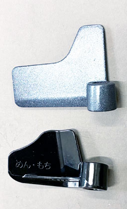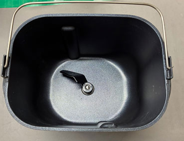 前置きが長くなりましたが、HBによるうどん生地作成手順を簡単に説明します。HBの本来の目的はパンを焼くことですが、このパンケースを利用してうどん生地を作ることもできます。パンケース内は、中心に羽根が固定され、これが回転することで、うどん生地を捏ね上げます。パン生地とうどん生地では加水量が異なるので、両者では使用する羽根の形状も異なり、うどん生地用の羽根は、画像下のように少し短くまた垂直方向に傾斜しています。