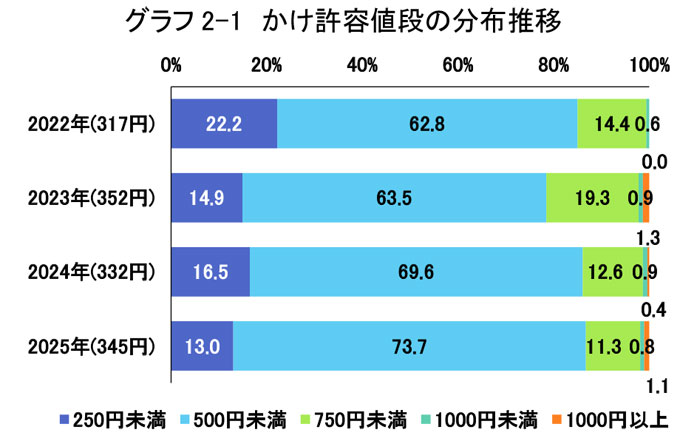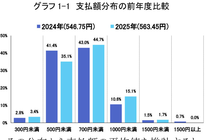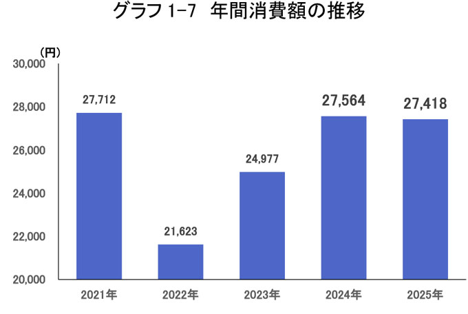 ①、②から推計すると、一人辺りの年間支出額は27,418円となり前年度(2024年)の27,564円よりも146円の減少となりました。つまり1回当たりの平均支出額が16.7円増加したものの、平均回数が0.09回減少したため、結果として減少しました。