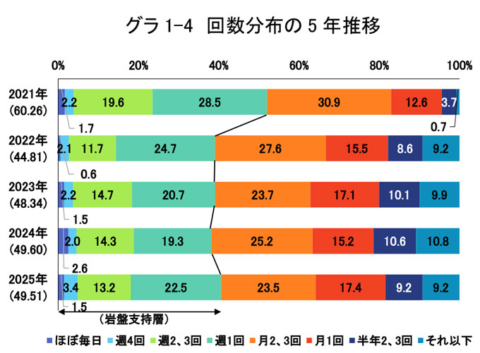 平均回数では、多い順に「月に2、3回」(23.5%)>「週1回」(22.5%)>「月に1回」(17.4%)>「週に2、3回」(13.2%)>「週に4回」(3.4%)>「ほぼ毎日」(1.5%)と続きます。「週一回」以上を合計すると、22.5%+13.2%+3.4%+1.5%=40.6%となり、調査元ではこれを岩盤支持層とよんでいます。